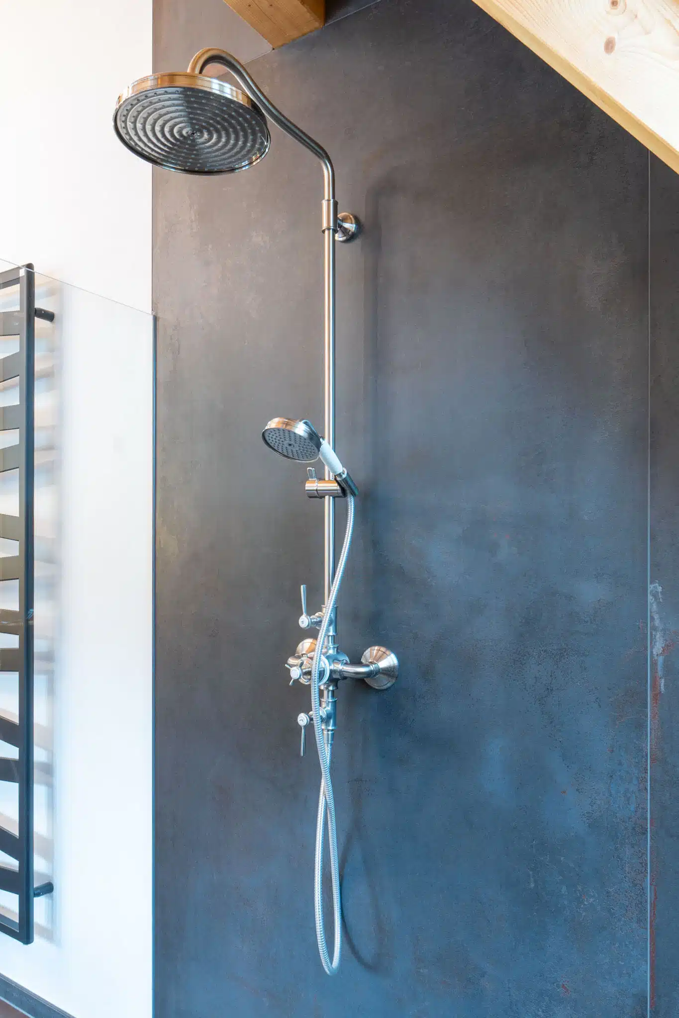 Das großzügige Badezimmer bietet eine ebenerdige Dusche, einen Waschtisch in der Raummitte sowie eine freistehende Badewanne.